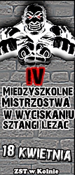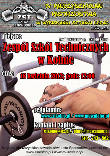<<< nowszy Czytaj następny news starszy >>> 12-03-2012 Regulamin IV Międzyszkolnych Mistrzostw w Wyciskaniu Sztangi Leżąc Poniżej przedstawiamy Regulamin IV Międzyszkolnych Mistrzostw w Wyciskaniu Sztangi Leżąc 2012. Zawody odbędą się 18 kwietnia 2012 roku w Zespole Szkół Technicznych w Kolnie. PLAKAT