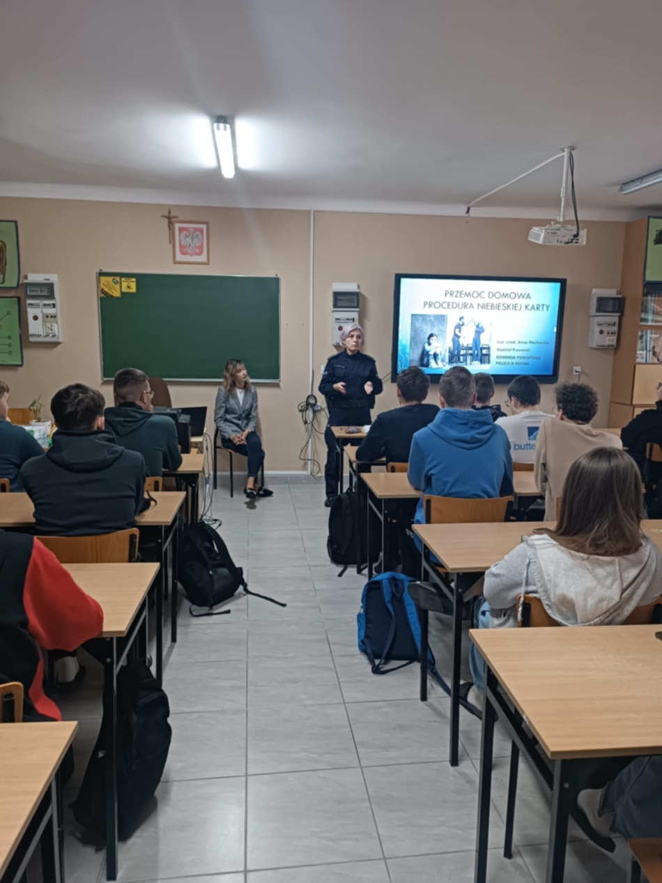 4. W ramach kampanii promującej przeciwdziałania przemocy rówieśniczej w prelekcji uczestniczyli Funkcjonariusze Komendy Powiatowej Policji w Kolnie oraz raz Pani Agnieszka Magda Bałdyga Zastępca Przewodniczącego Zespołu Interdyscyplinarnego ds. Przeciwdziałania Przemocy w Gminie Kolno.