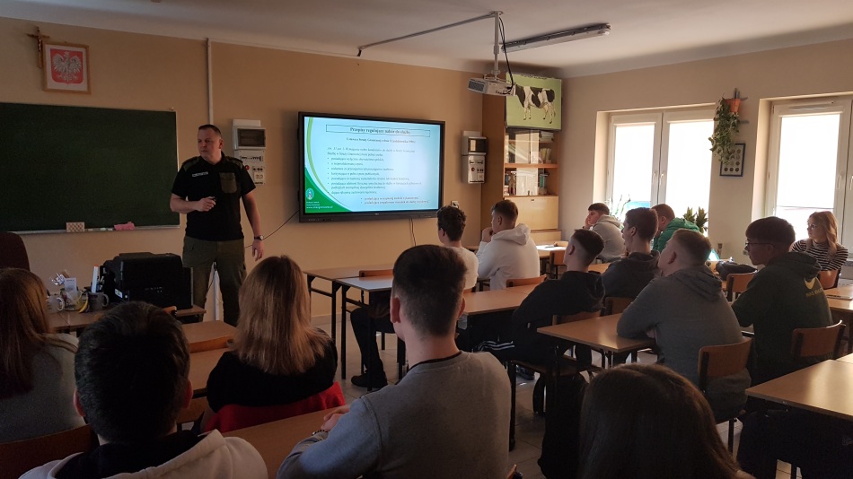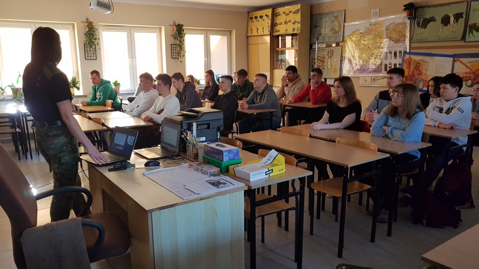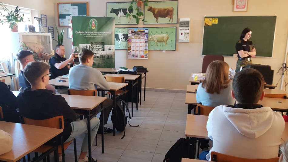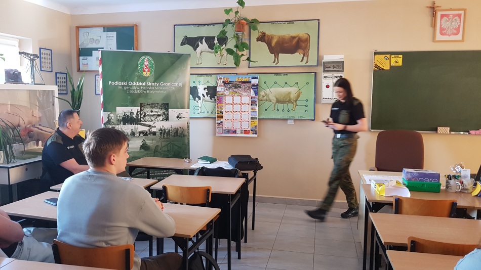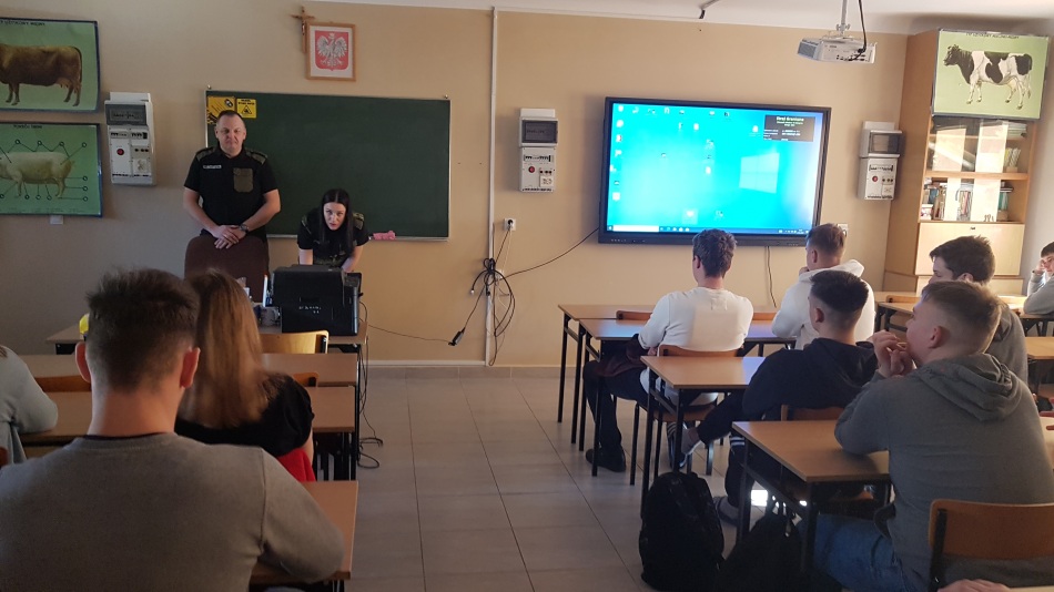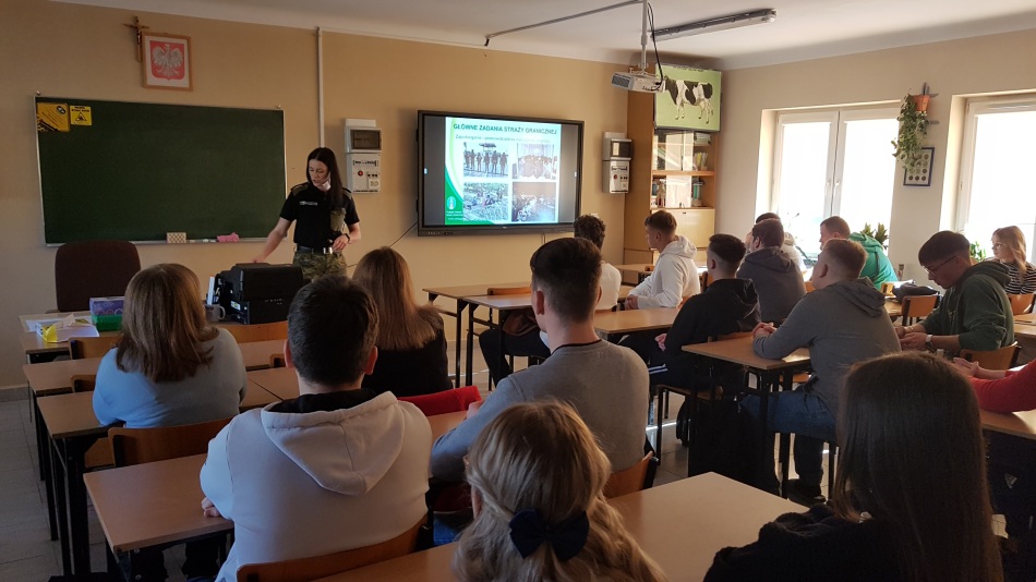Starszy chorąży sztabowy Straży Granicznej – Mariusz Węgierski i chorąży Straży Granicznej – Julita Gryko przygotowali krótką prezentację na temat zalet wstąpienia do służby Straży Granicznej. Wyjaśnili procedury rekrutacji dla kandydatów do 26 roku życia. Przedstawili możliwości ukończenia studiów wyższych i rozwoju kariery zawodowej. Nasi goście wytłumaczyli również, na czym polega służba w Straży Granicznej. Na końcu uczniowie mogli zadawać pytania dotyczące zalet i wad służby w tym sektorze.