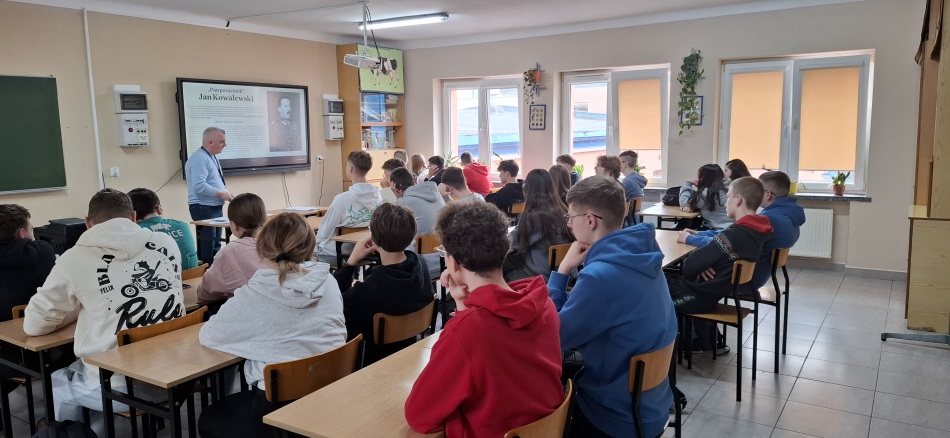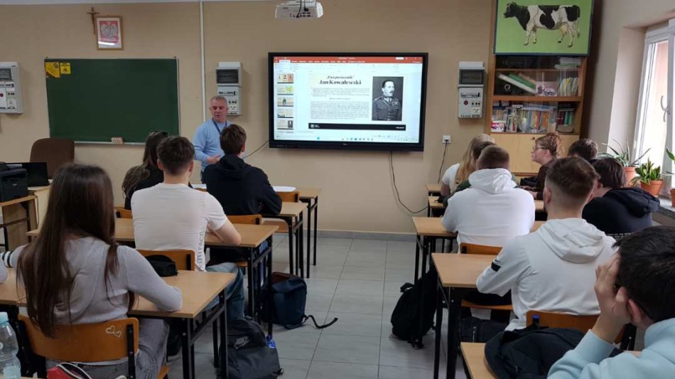 16 kwietnia 2025 r. w naszej szkole miały miejsce niecodzienne lekcje historii. Poprowadził je pan Marek Gajewski – historyk wojskowości, starszy specjalista Oddziałowego Biura Edukacji Narodowej IPN w Białymstoku. Zajęcia rozpoczęły się od krótkiego wykładu poświęconego Zbrodni Katyńskiej, której 85. rocznicę upamiętnialiśmy 13 kwietnia, w Dniu Pamięci Ofiar Zbrodni Katyńskiej. Historyk przypomniał okoliczności mordu dokonanego przez radzieckie NKWD na blisko 22 tysiącach polskich obywateli, głównie oficerów Wojska Polskiego, ale także policjantów, nauczycieli, urzędników i przedstawicieli inteligencji. Prowadzący podkreślił, jak wielką stratę poniosła Polska, tracąc znaczną część elity wojskowej i intelektualnej.
