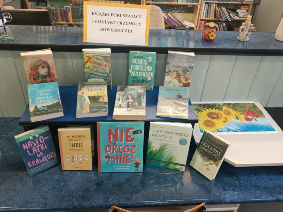 [1. Pedagog szkolny wraz z nauczycielem bibliotekarzem przygotowali gazetkę tematyczną, która została połączona, z wystawą literatury o tematyce Przemocy Rówieśniczej.