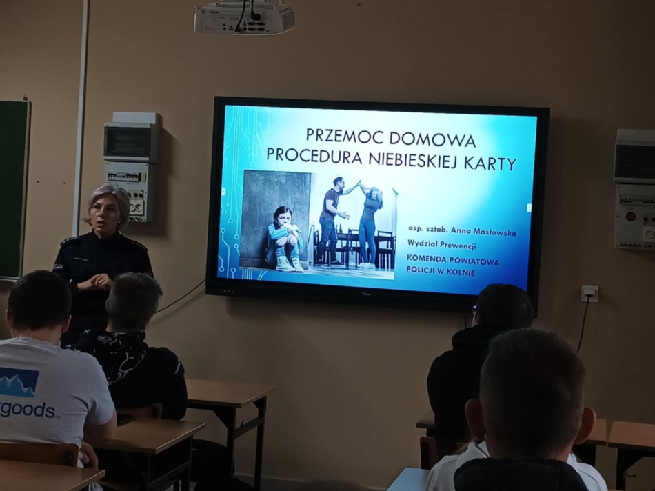 4. W ramach kampanii promującej przeciwdziałania przemocy rówieśniczej w prelekcji uczestniczyli Funkcjonariusze Komendy Powiatowej Policji w Kolnie oraz raz Pani Agnieszka Magda Bałdyga Zastępca Przewodniczącego Zespołu Interdyscyplinarnego ds. Przeciwdziałania Przemocy w Gminie Kolno.