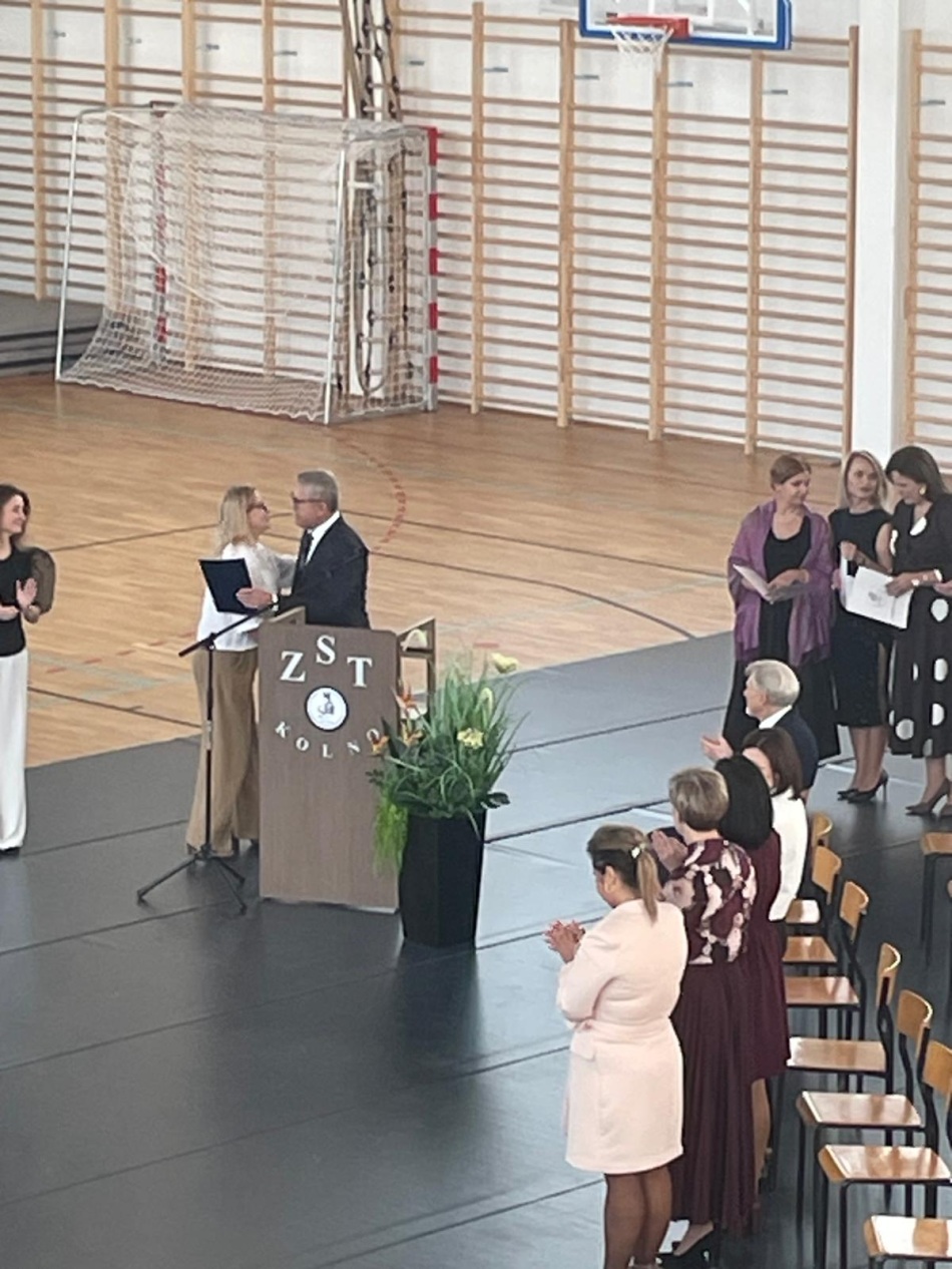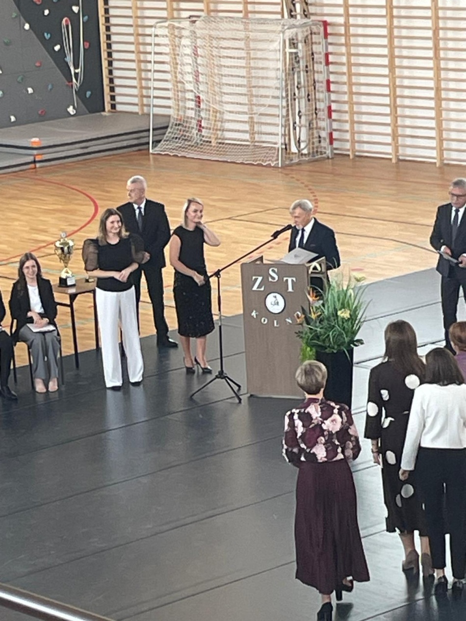 Nie zabrakło życzeń i kwiatów, których wręczanie umilał nam swą grą na gitarze Igor z klasy I TEL. Samorząd Uczniowski pod kierunkiem Pani Izabeli Wądołowskiej wykonał z tej okazji kartki z życzeniami. Pan Sławomir Zalewski oraz dyrektor szkoły Pan Eugeniusz Gromadzki wręczyli wybranym nauczycielom nagrody za trud ich pracy. Podczas uroczystości wręczono także Puchar Dyrektora Szkoły za II półrocze ubiegłego roku szkolnego 2024/2025, który zdobyła klasa III Technikum w zawodzie technik elektryk.