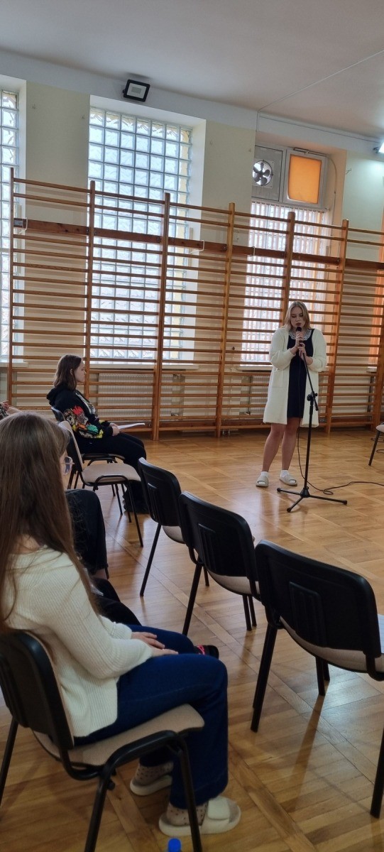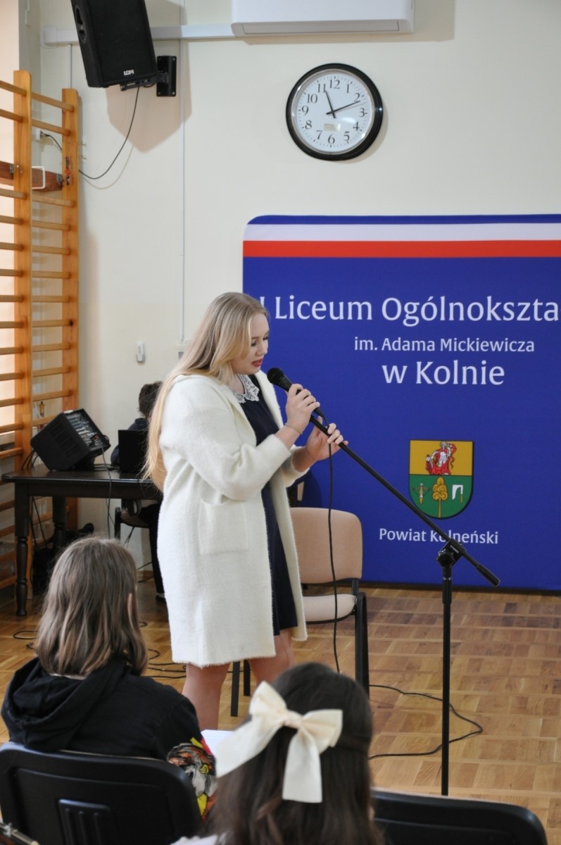 Dnia 30 października 2025 roku w I Liceum Ogólnokształcącym w Kolnie odbył się Międzyszkolny Konkurs Pieśni Patriotycznej i Poezji Śpiewanej. Celem konkursu było m.in. kształtowanie postaw patriotycznych, upowszechnianie wartości narodowych, pielęgnowanie pamięci historycznej poprzez muzykę i poezję, a także rozwijanie wrażliwości artystycznej młodzieży. Uczestnicy mieli za zadanie przygotować do prezentacji jedną pieśń patriotyczną oraz jeden utwór z poezji śpiewanej. Naszą szkołę reprezentowały: Magdalena Poreda i Kinga Zadroga.