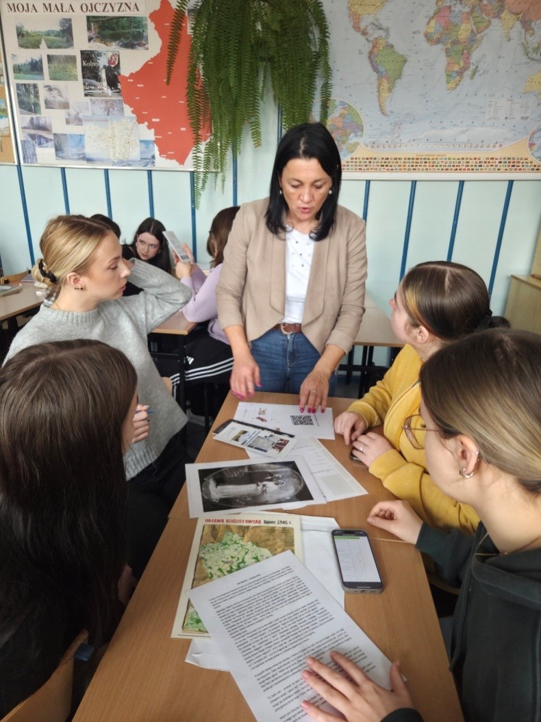 25 listopada 2025 r. w naszej szkole miały miejsce niecodzienne lekcje historii. Poprowadziła je pani Teresa Dzięgielewska – starszy inspektor Oddziałowego Biura Edukacji Narodowej IPN w Białymstoku. Zajęcia rozpoczęły się od krótkiego wykładu poświęconego OBŁAWIE AUGUSTOWSKIEJ, której 80. rocznicę obchodzono w Dzień Pamięci Ofiar 12 lipca tego roku. Pani inspektor przypomniała okoliczności operacji wojskowej przeprowadzonej w lipcu 1945 roku przez oddziały Armii Czerwonej, wojska Ludowego Komisariatu Spraw Wewnętrznych Związku Radzieckiego oraz wydzielone oddziały Ludowego Wojska Polskiego i Urzędu Bezpieczeństwa. Akcja pacyfikacyjna przeprowadzona była na obszarze Puszczy Augustowskiej oraz w jej okolicach. Prowadząca podkreśliła, że oddziały radzieckie otaczały tamtejsze wsie, aresztując ich mieszkańców podejrzanych o kontakty z partyzantką niepodległościową.